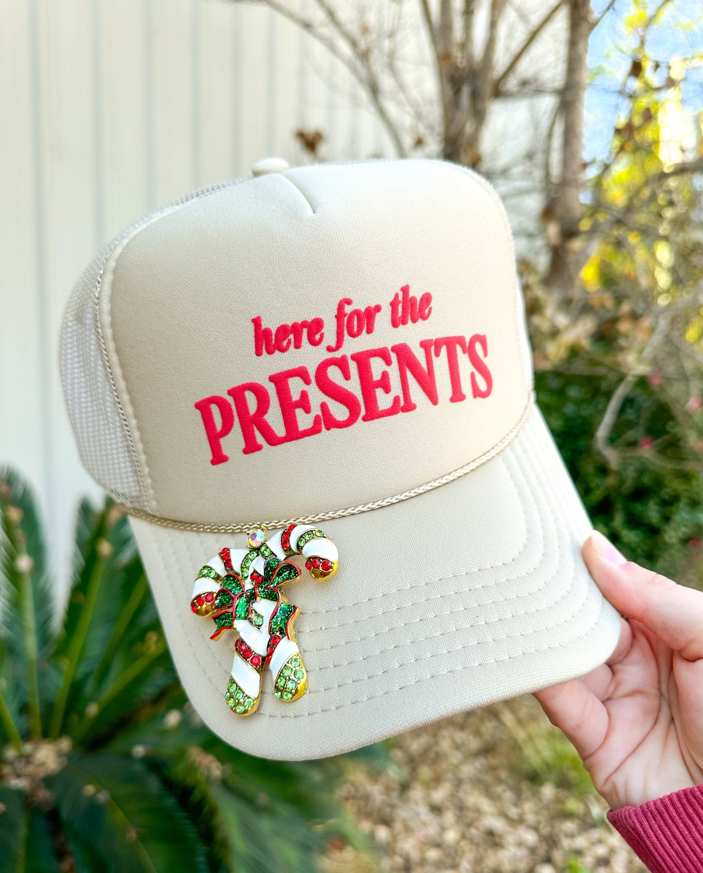 Make your holiday intentions crystal clear with our Here for the Presents tan foam trucker hat. Featuring bold red lettering on a neutral tan backdrop, this festive favorite is all about bringing the cheer (and unwrapping it). The playful look is elevated with an optional green-and-gold chain across the brim and a candy cane pin for extra holiday sparkle. Lightweight, breathable, and finished with an adjustable snapback for the perfect fit, it’s your go-to accessory for Christmas parties, gift swaps, and festive photo ops.