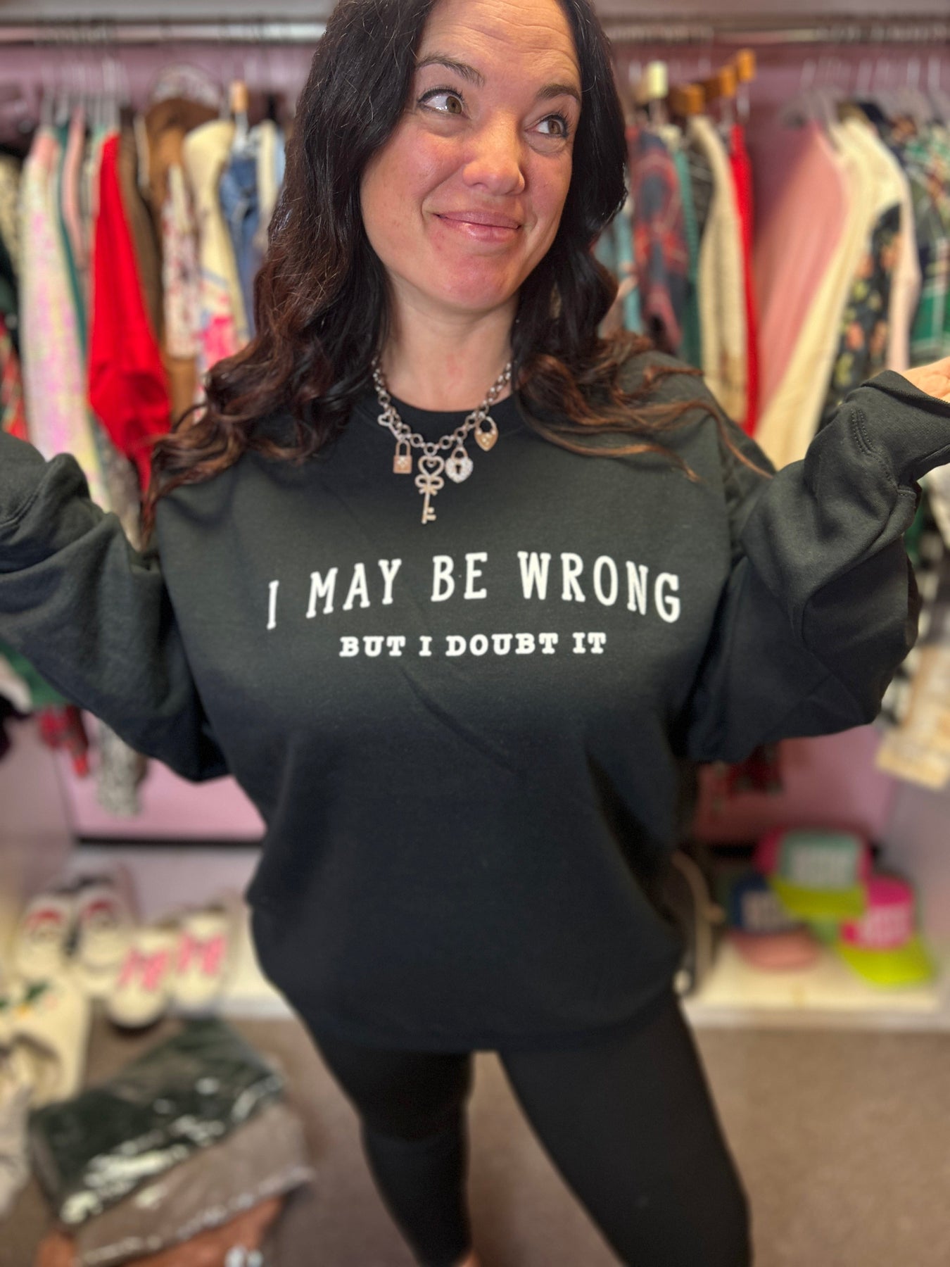 Introducing the May Be Wrong But I Doubt It Sweatshirt—the viral print you've been waiting for, now in a comfortable everyday layer. Crafted from a durable poly/cotton blend, this unisex sweatshirt delivers the perfect balance of softness and structure. The relaxed fit works for everyone, making it an effortless addition to any wardrobe. Whether you're making a statement or simply staying cozy, this piece combines bold attitude with reliable comfort.