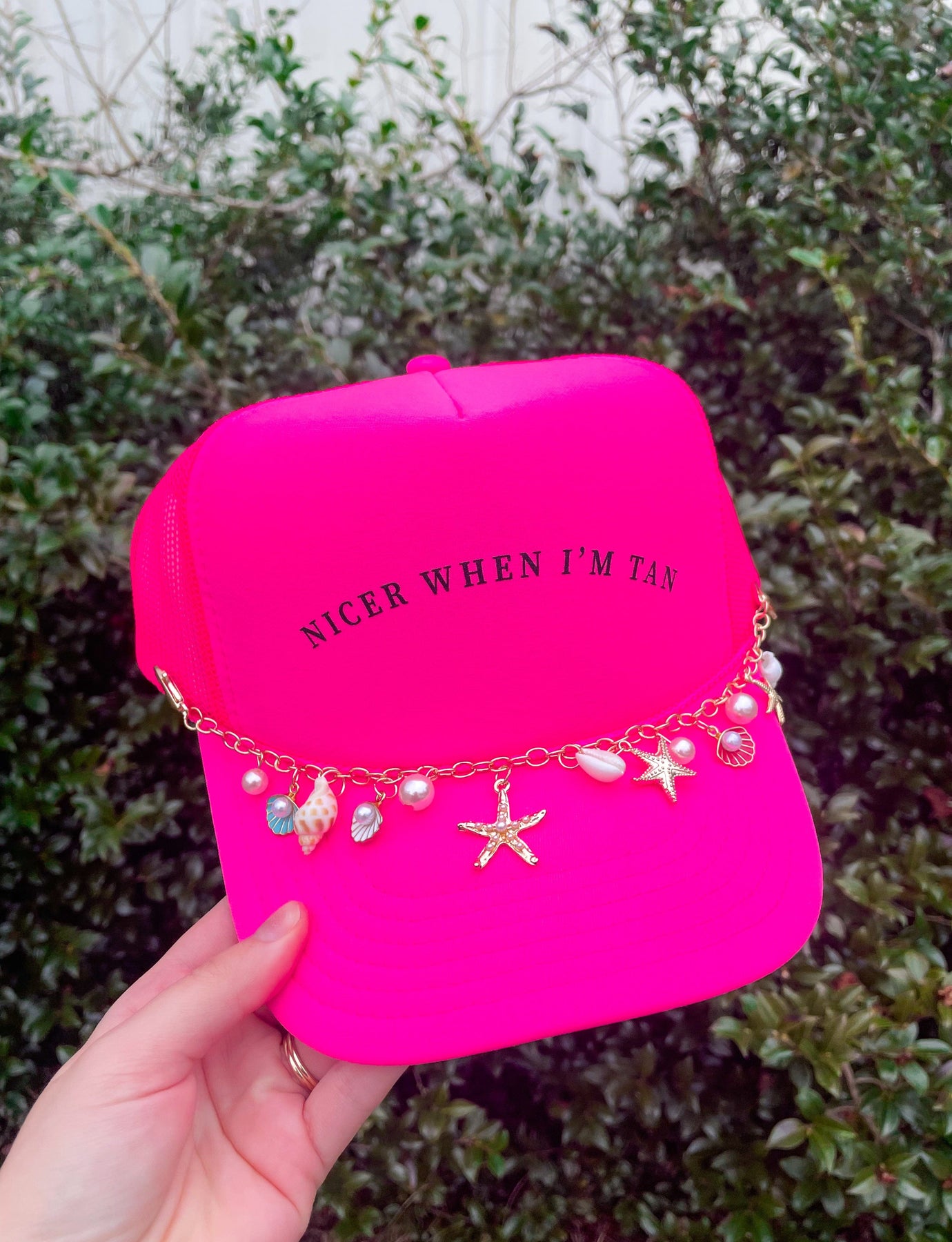 Sun out, sass out. This hot pink foam trucker hat brings the heat with a cheeky "Nicer When I'm Tan" graphic—because let’s be real, everything feels better with a glow. The structured foam front and breathable mesh back keep things cool, while the adjustable snapback serves up the perfect fit. Equal parts attitude and sunshine, this hat is made for pool days, beach trips, and bronzed vibes only. If you choose the hat with chain option, chain design may vary for a unique touch.