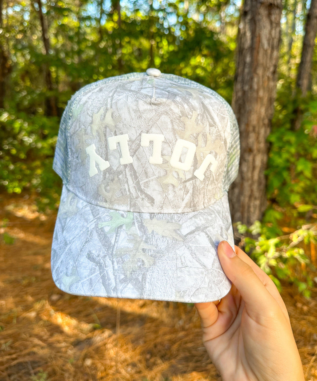 Just A Girl Who Loves Jesus Cream/Camo Canvas Trucker