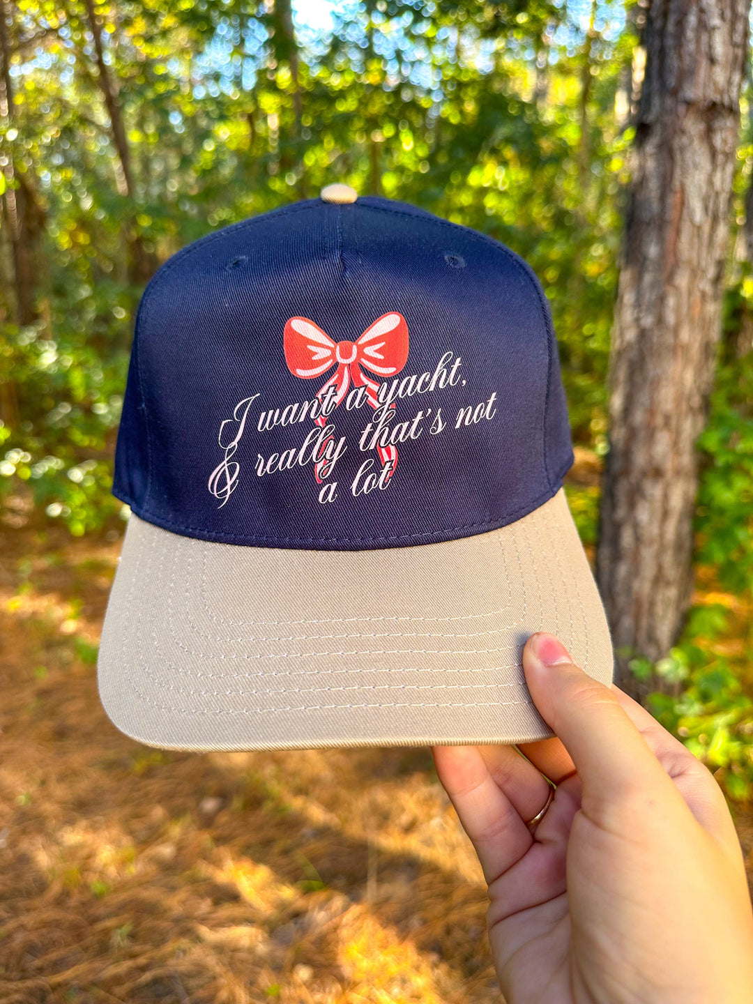 I Want A Yacht & That's Really Not Alot Navy/Tan Canvas Trucker