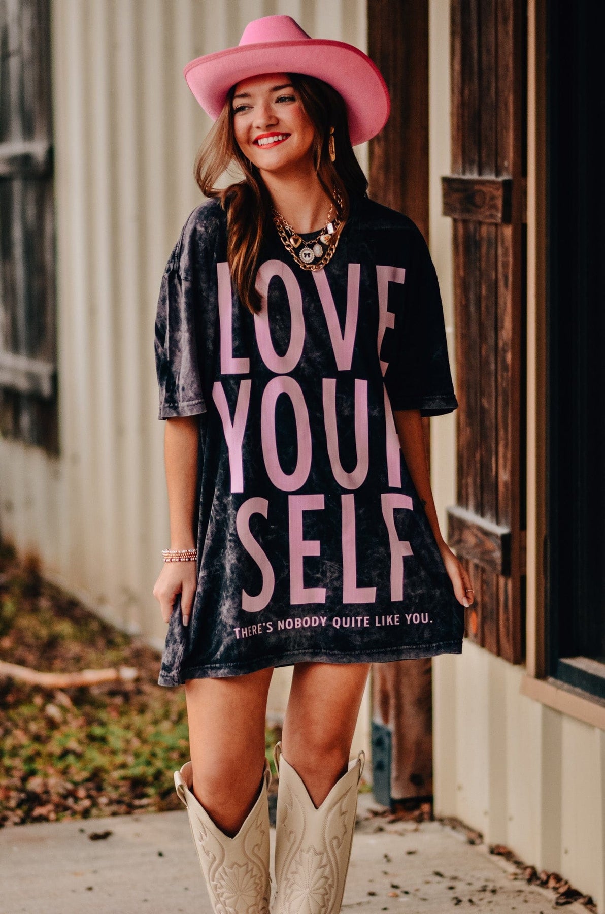 Spread the good vibes with this vintage wash tee that's equal parts comfort and confidence. Featuring a bold, eye-catching print that says what we're all thinking—love yourself—this relaxed-fit essential pairs perfectly with your favorite jeans or shorts. Soft, pre-washed fabric gives it that effortlessly cool, lived-in feel from day one. Whether you're running errands or hanging with friends, this tee is your daily reminder to embrace self-love with style.