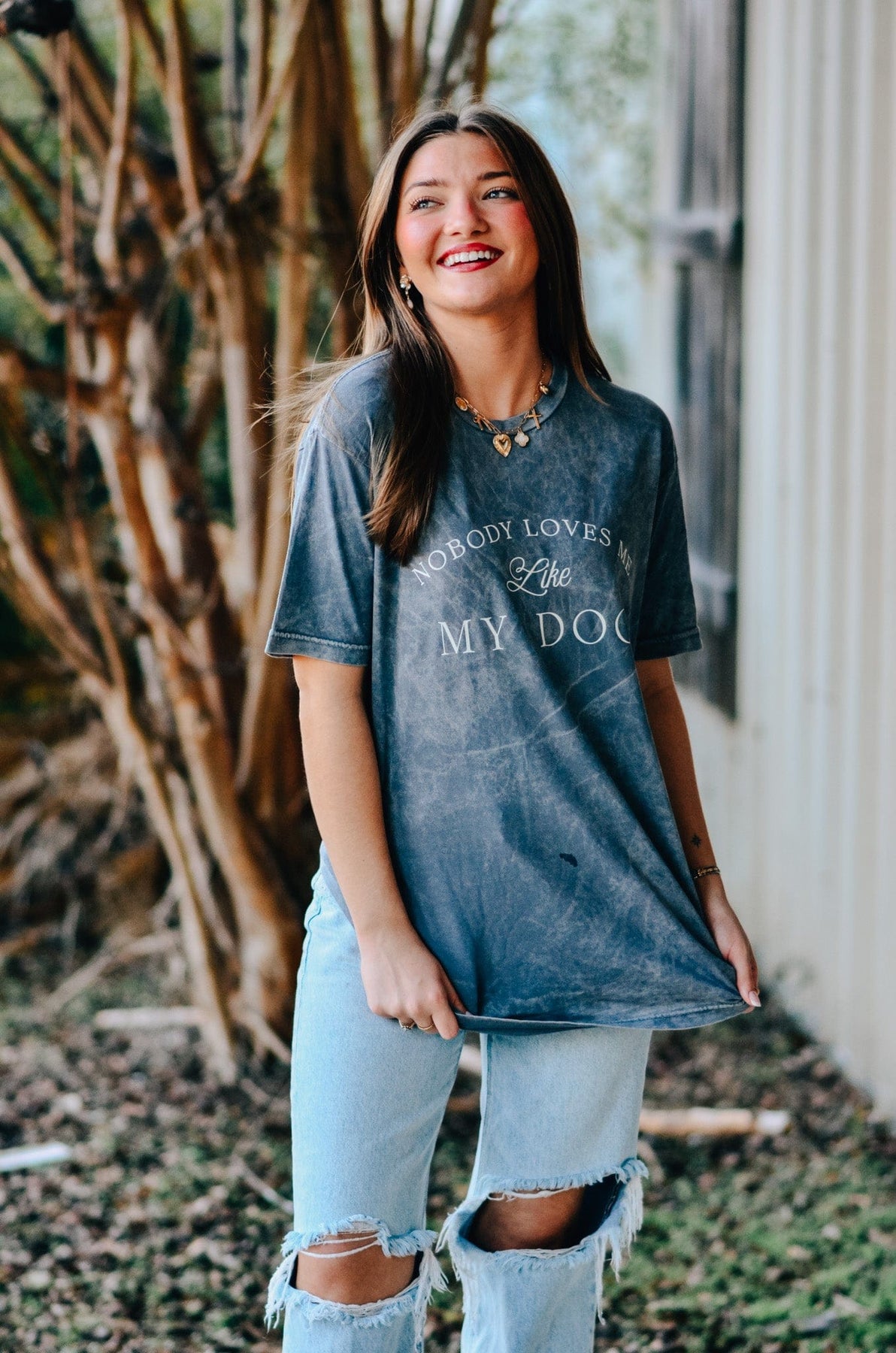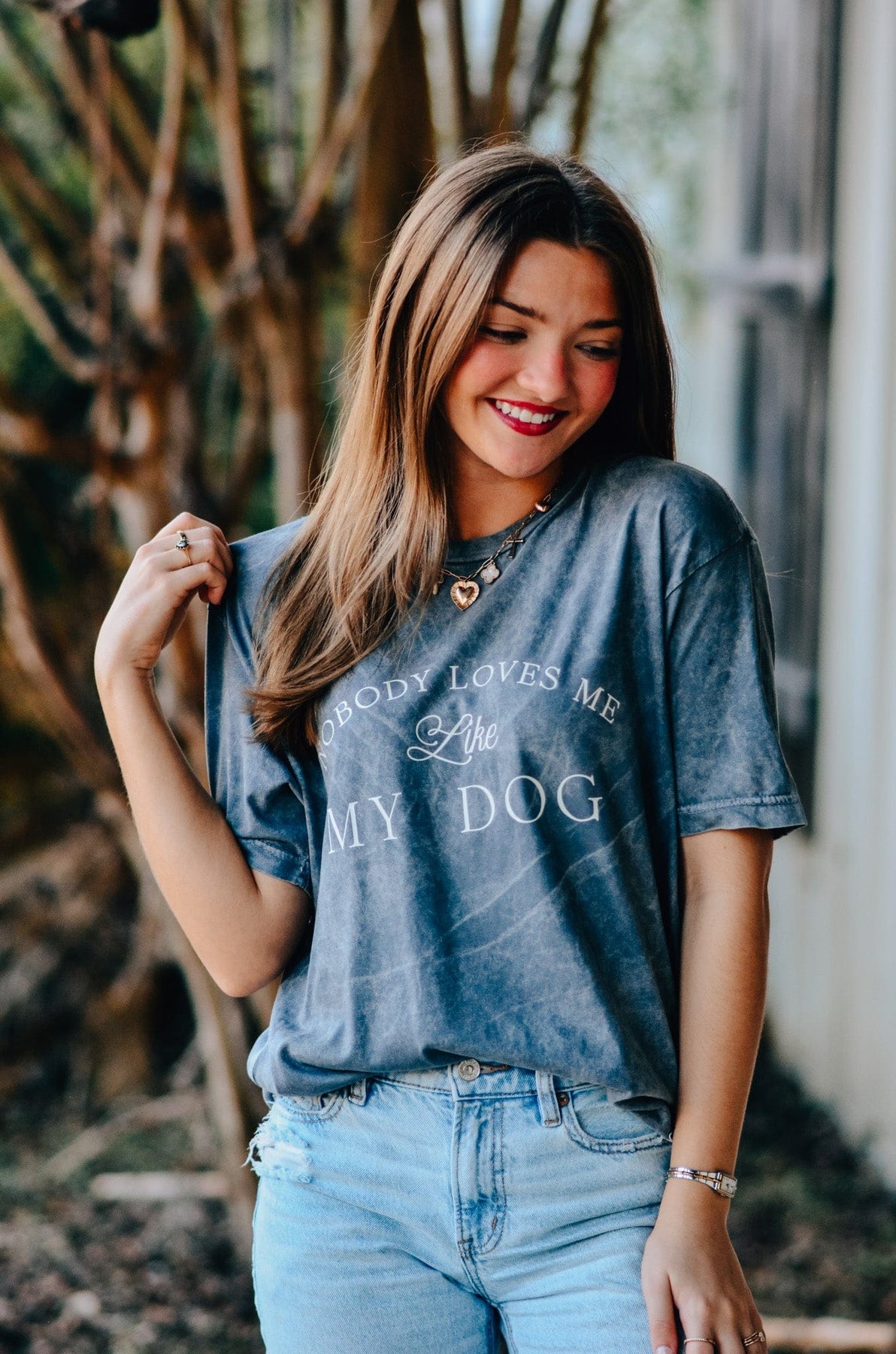 Nobody Loves Me Like My Dog Tee Celebrate the unconditional love of your furry best friend with this charming gray tee. Perfect for dog parents who know that their pup's affection is truly one-of-a-kind, this playful shirt captures that special bond in a lighthearted way. Soft, comfortable, and ideal for casual wear, it's a fun conversation starter that any dog lover will appreciate. Whether you're running errands or lounging at home, wear your dog devotion with pride.