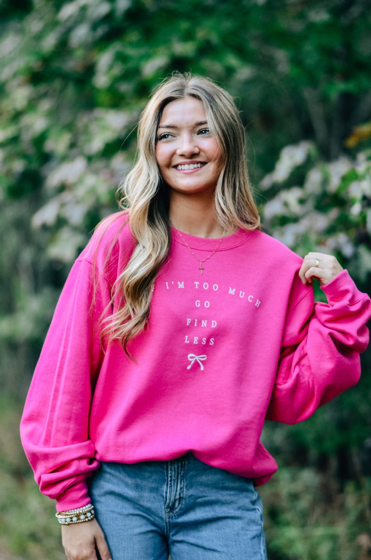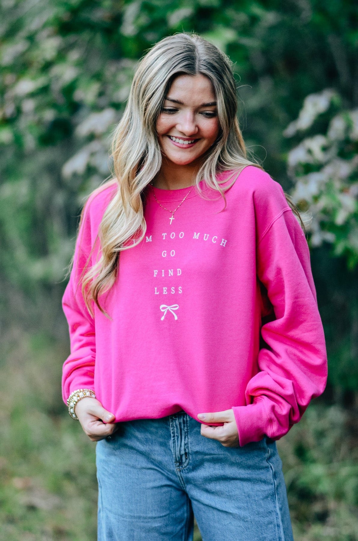 Bold, sassy, and unapologetic—our If I’m Too Much Go Find Less sweatshirt says it all. Featuring clean white lettering on the front and a statement bow graphic on the back, this hot pink pullover is made for those who embrace their extra.